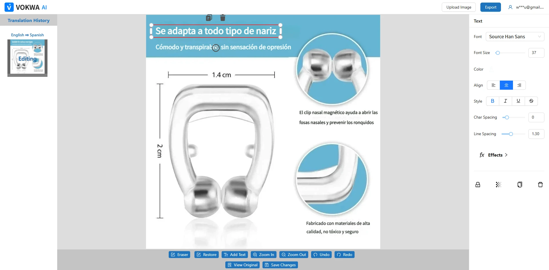 VOKWA AI accurately recognizes complex layouts, tilted text, and even artistic fonts. After translating into Spanish, the AI automatically adjusts font size and spacing to ensure the new copy fits perfectly within the original design.